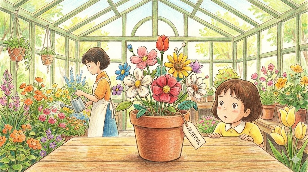- 모조품: 진짜와 비슷하게 만들었지만 자연산이 아닌 것(감미료, 잔디, 조명).