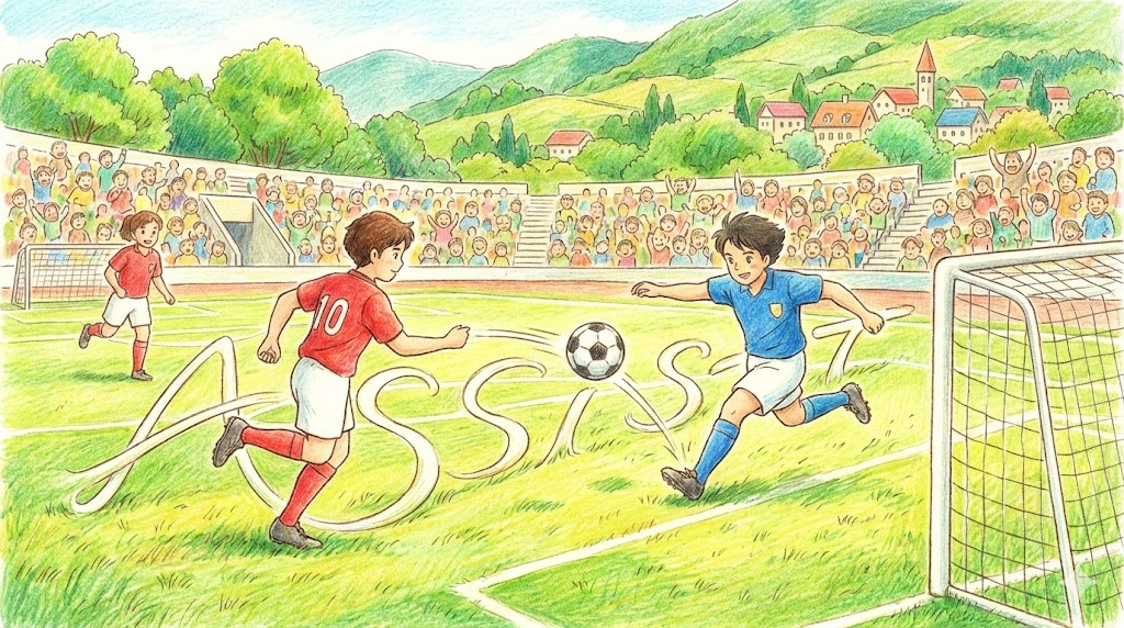 - 해석: (스포츠) 득점으로 연결되는 결정적인 패스를 하는 것입니다. 한국어에서도 그대로 "어시스트하다"라고 씁니다.