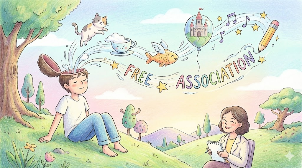 원래는 심리학자 프로이트(Freud)가 사용한 정신분석 기법입니다. 환자에게 아무런 검열 없이 머릿속에 떠오르는 단어나 생각을 즉시 말하게 하는 방법입니다. 창의적인 글쓰기나 아이디어 회의(브레인스토밍)를 할 때도 이 방법을 자주 씁니다.