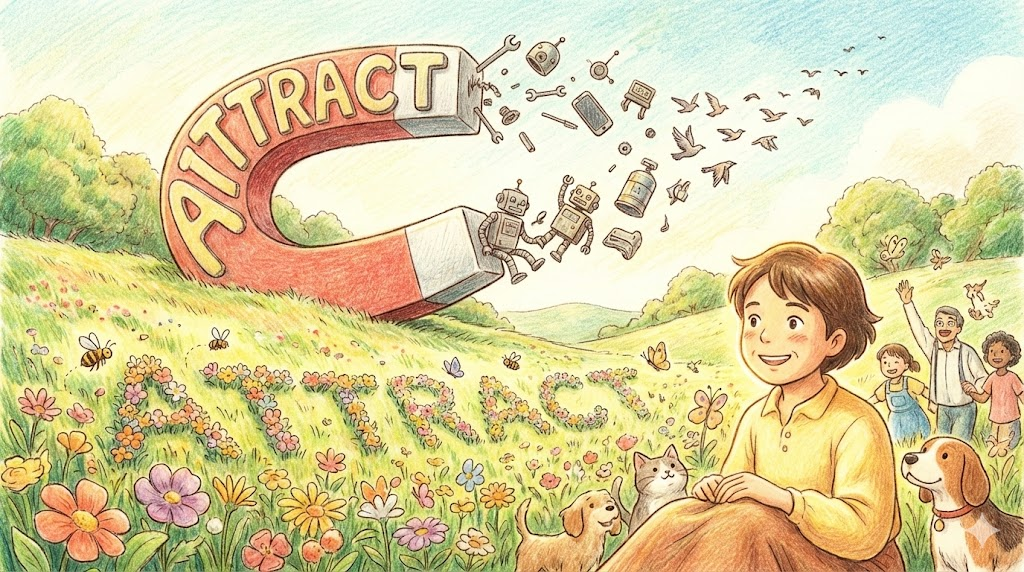 'attract'는 물리적으로나 심리적으로 당기는 것입니다. "Opposites attract"(반대끼리 끌린다)는 유명한 말입니다. 비즈니스에서는 'attract customers/investment'(유치하다), 관광에서는 'tourist attraction'(명소)으로 쓰입니다. 나쁜 행동은 'attract criticism'(비난을 사다) 할 수 있습니다.