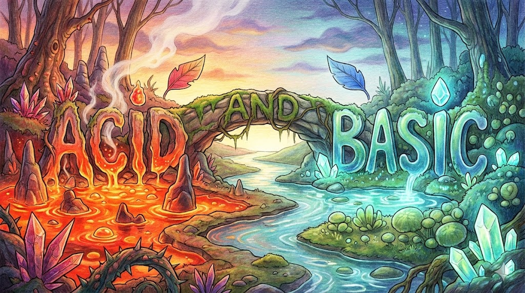 화학 시간(Chemistry)에 배우는 pH 농도를 설명할 때 쓰는 말입니다. 리트머스 종이를 빨갛게 만드는 산성(Acid) 과 파랗게 만드는 염기성(Basic, 또는 Alkaline) 을 짝으로 묶어 부르는 표현입니다. 참고로 'Basic'이 여기서 '기초'가 아니라 '염기(Base)의 성질을 띤'이라는 뜻으로 쓰였다는 점이 포인트입니다.