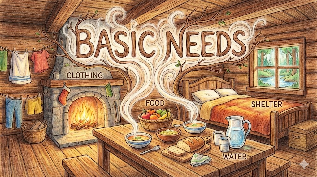 - 해석: 인간이 생존하기 위해 꼭 필요한 의식주(음식, 물, 거주지 등)를 말합니다.