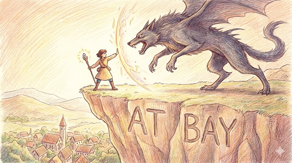 사냥감이 사냥개들에게 둘러싸여 더 이상 도망갈 곳 없이 '궁지에 몰린 상태' 를 말하거나, 반대로 맹수나 적이 나를 덮치지 못하도록 무기를 들고 '거리를 유지하며 막고 있는(Holding off) 상태' 를 말합니다. 오늘날에는 주로 질병, 두려움, 적 등을 '가까이 오지 못하게 막다(Keep at bay)' 라는 형태로 가장 많이 쓰입니다.