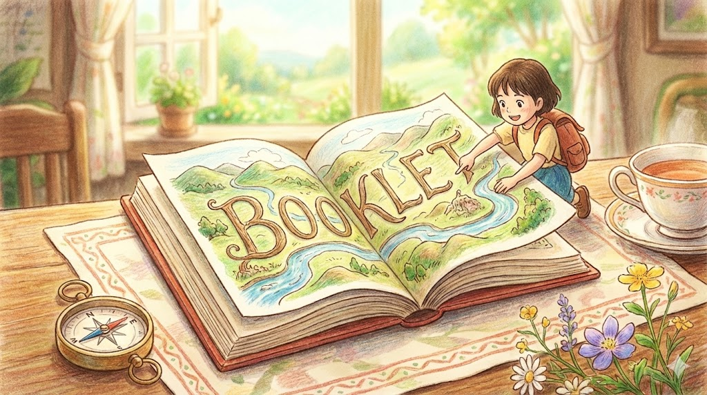 여행사나 관광 안내소(Tourist Information Center)에 가면 꽂혀 있는 얇은 책자들입니다. 특정 도시나 관광지의 '지도, 볼거리, 맛집 정보' 가 예쁜 사진과 함께 요약되어 있습니다. "Travel brochure" 또는 "Guidebook"이라고도 부르지만, 얇은 형태일 때 Booklet을 씁니다.