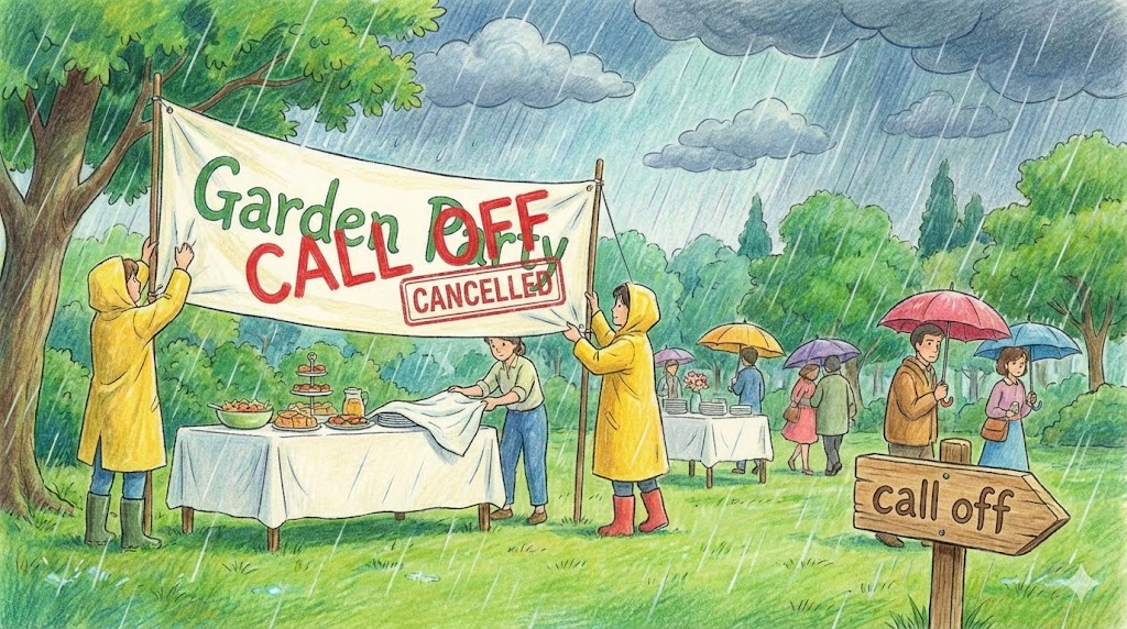 | call off | 취소하다 | 구동사, '중단'. | '소리쳐서' '(' 'call' ') '진행' '중인' '것을' '떼어내다' '(' 'off' ')'. |
