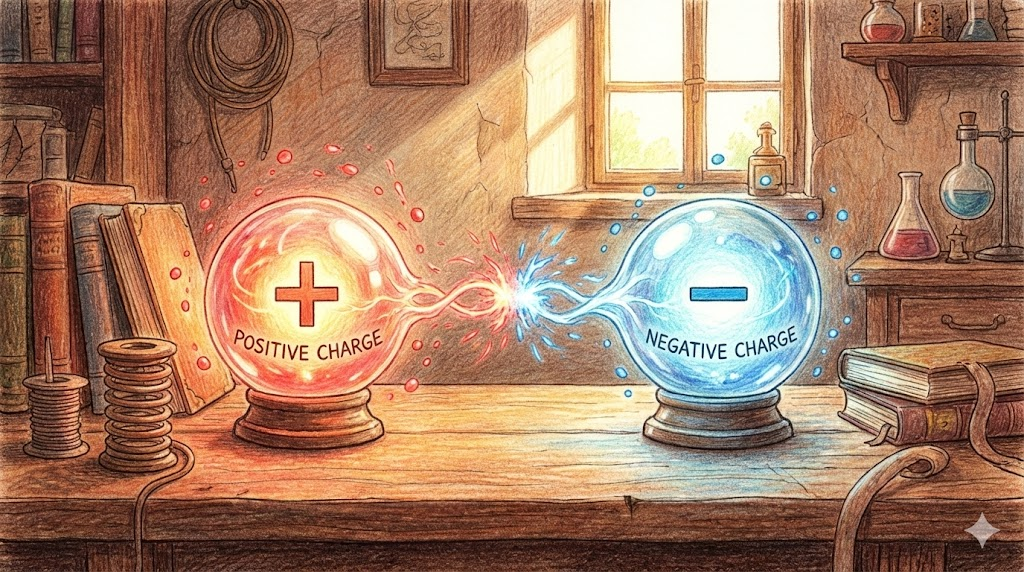 - Opposite charges attract; positive attracts negative. (반대 전하는 서로 당깁니다; 양전하는 음전하를 당깁니다.)