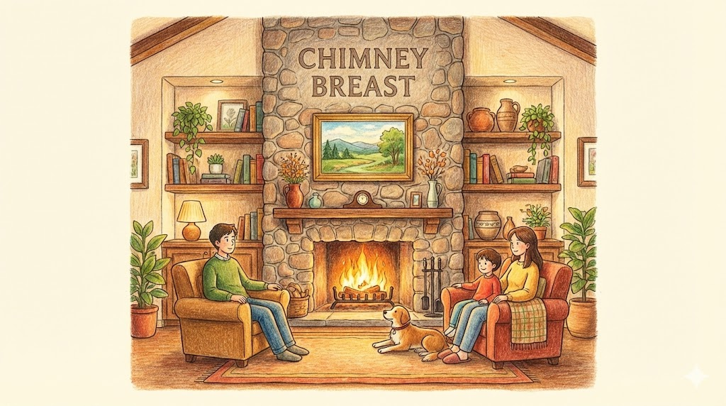 집 밖이 아니라 '방 안(실내)'에서 볼 때, 벽난로와 연통이 지나가는 자리가 벽 앞으로 튀어나온 부분을 말합니다. 보통 거실의 중심이 되며, 사람들은 이 튀어나온 벽(Breast)에 TV를 걸거나 그림을 걸어 장식하고, 양옆의 들어간 공간(Alcove)에는 선반을 설치하곤 합니다.