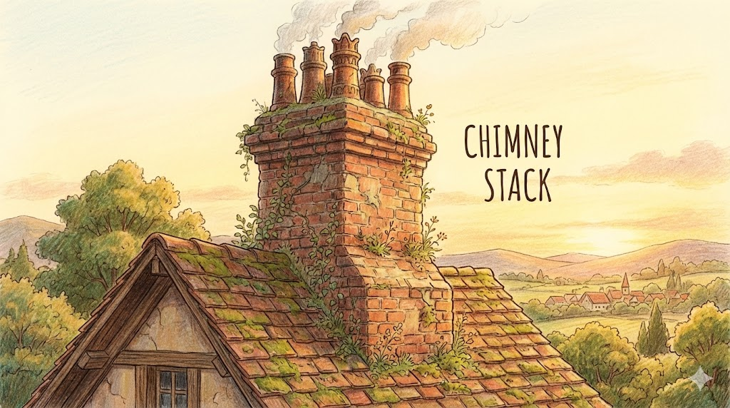 - Chimney stack: 지붕 위로 솟아 있는 벽돌이나 돌로 된 굴뚝의 '몸통(본체)' 입니다.