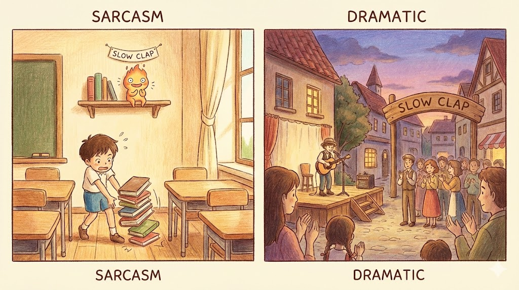 - 해석: (회화/영화) 감동적인 순간에 천천히 시작되는 박수(긍정)일 수도 있지만, 현대에는 주로 상대방의 멍청한 행동이나 실패를 비꼬기 위해 천천히, 억지로 치는 박수(부정/조롱) 를 뜻합니다.