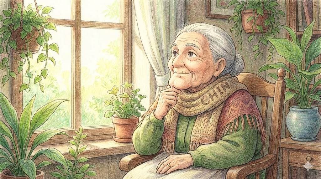 'chin'은 얼굴의 가장 아랫부분인 "턱(아래턱 끝)" 을 뜻합니다. 영어권 문화에서 턱을 치켜드는 것은 자신감과 용기를, 턱을 맞는 것은 패배나 비평을 견디는 것을 상징합니다.