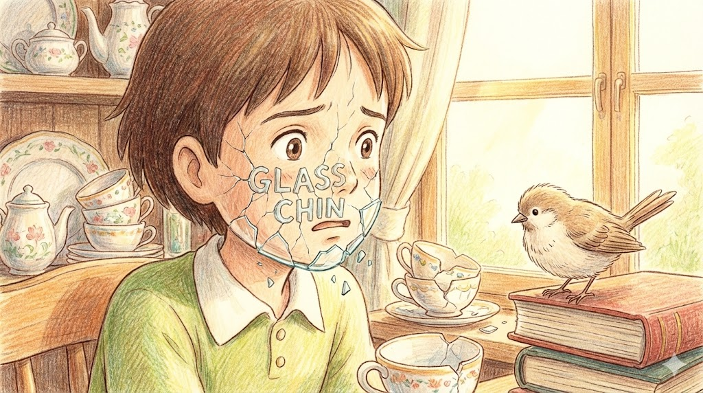 - 해석: (스포츠/비유) 유리처럼 깨지기 쉬운 턱이라는 뜻으로, 조금만 맞아도 금방 쓰러지는 권투 선수나 비판에 쉽게 무너지는 사람을 조롱할 때 씁니다. (Glass jaw)