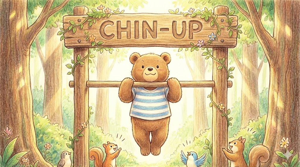 - 해석: 철봉 위로 턱(chin)을 올리는(up) 운동입니다. 손등이 보이게 잡는 것은 'Pull-up', 손바닥이 보이게 잡는 것은 'Chin-up'으로 구별하기도 합니다.
