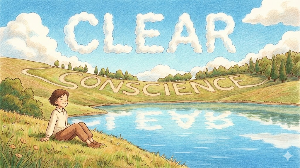 - Clear conscience: 마음에 걸리는 게 없이 깨끗한 상태, '떳떳한 양심(거리낌 없는 마음)' 입니다.