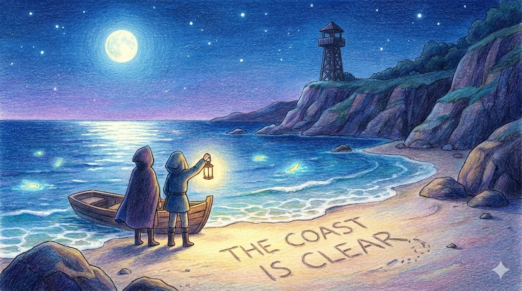 - 해석: (관용구) 밀수꾼들이 해안경비대가 없는 것을 확인하던 것에서 유래했습니다. 몰래 무언가를 하려 할 때 "보는 눈이 없다", "이제 움직여도 된다"는 신호로 씁니다.