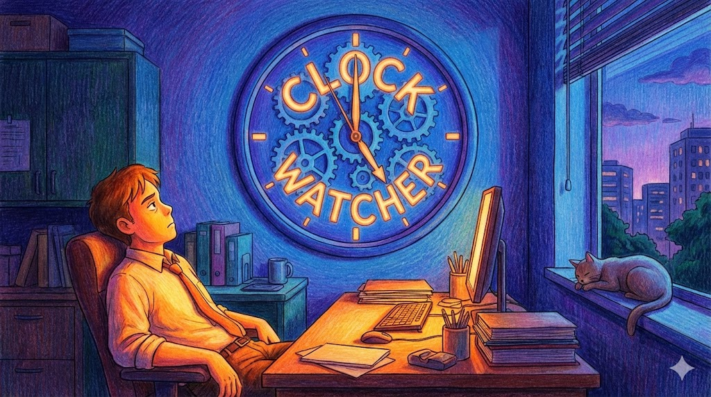 일하는 내내 시계(Clock)만 쳐다보며(Watcher) "언제 끝나지?" 하고 퇴근 시간만 기다리는 사람을 비꼬는 표현입니다. '일에는 관심 없고 빨리 집에 가고 싶어 안달 난 태도' 를 지적할 때 씁니다.