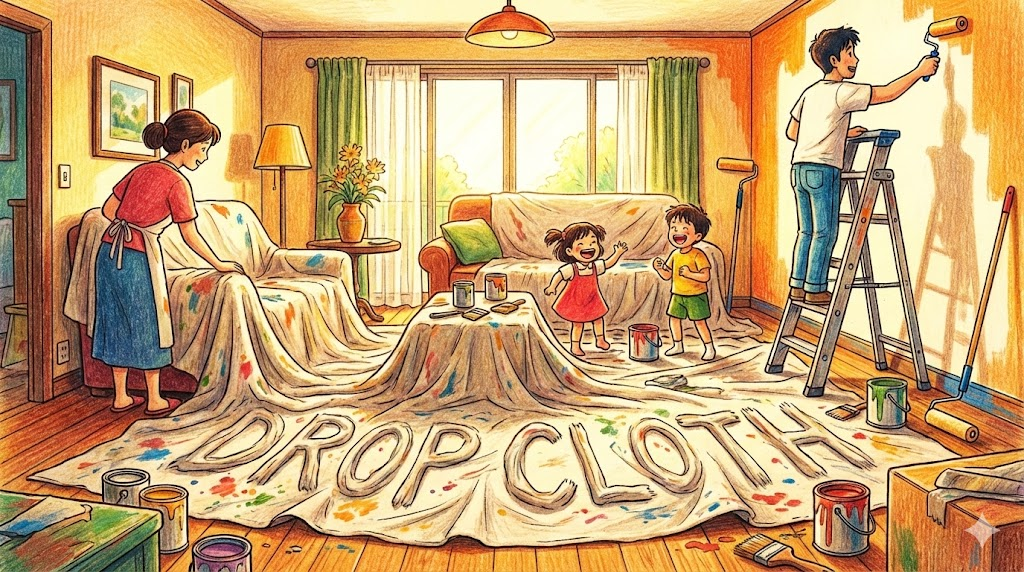 - Drop cloth: 페인트칠을 할 때 페인트 방울(drop)이 튀는 것을 막기 위해 가구나 바닥에 덮는 '바닥 깔개(보양지/덮개)' 입니다.