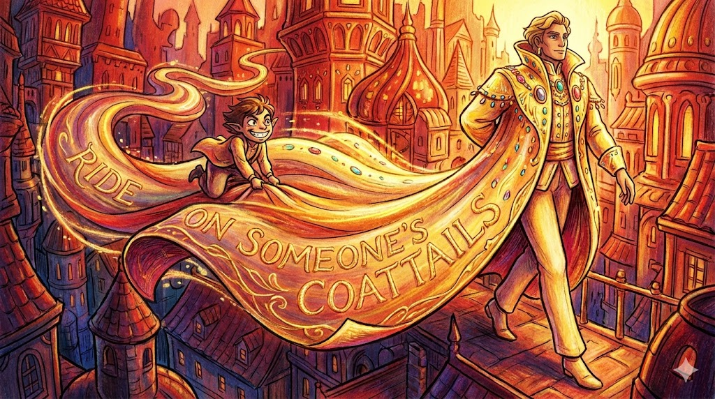 연미복의 긴 뒷자락(Coattails) 위에 올라타고 가는 모습을 상상해 보세요. 자신의 노력이나 능력으로 성공하는 것이 아니라, '이미 성공하거나 힘 있는 사람에게 묻어가서 덩달아 이득을 보는 것' 을 말합니다. 부모의 명성에 기대거나, 인기 있는 동료 덕분에 성과를 얻을 때 씁니다.