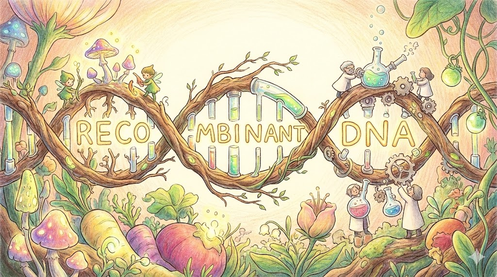 서로 다른 생물종의 DNA 분자를 인위적으로 결합하여 만든 '새로운 유전 정보의 조합' 을 말합니다. 유전공학의 핵심 기술로, 특정 단백질(인슐린 등)을 대량 생산하거나 질병 저항성이 강한 작물을 만드는 데 사용됩니다.