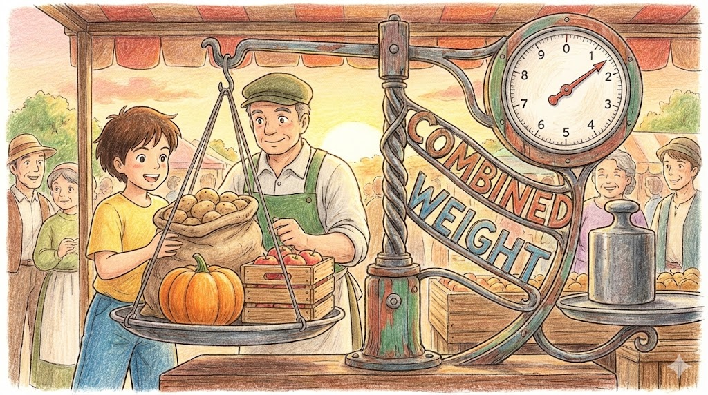 두 개 이상의 물건이나 사람의 무게를 모두 합쳤을 때의 '전체 무게' 를 의미합니다. 엘리베이터의 제한 하중을 확인할 때나, 택배 상자 여러 개의 무게를 합산할 때, 혹은 운동선수들의 체급을 합쳐서 말할 때 주로 사용합니다.