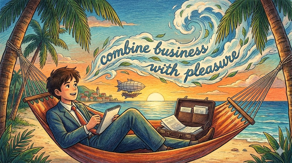 업무적인 목적(Business)으로 어딘가에 갔거나 일을 하면서, 동시에 개인적인 즐거움(Pleasure)도 함께 추구하는 상황을 말합니다. 가장 흔한 예는 '해외 출장을 가서 일을 마친 뒤 관광을 즐기는 것' 입니다. "Mix business with pleasure"라고도 합니다.