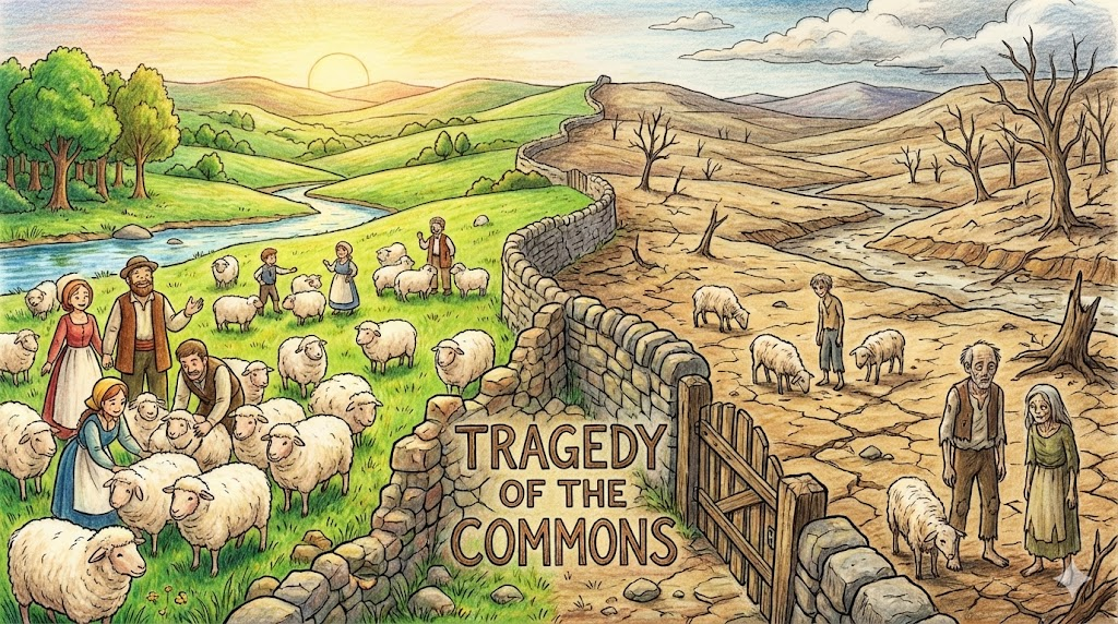 - Tragedy of the Commons: 마을의 공동 목초지(Commons)에 누구나 양을 마음대로 풀어서 먹일 수 있게 하면, 개개인의 이기심 때문에 결국 풀이 다 없어져서 모두가 망한다는 경제 이론, '공유지의 비극' 입니다. (자원 고갈 문제 설명에 사용)