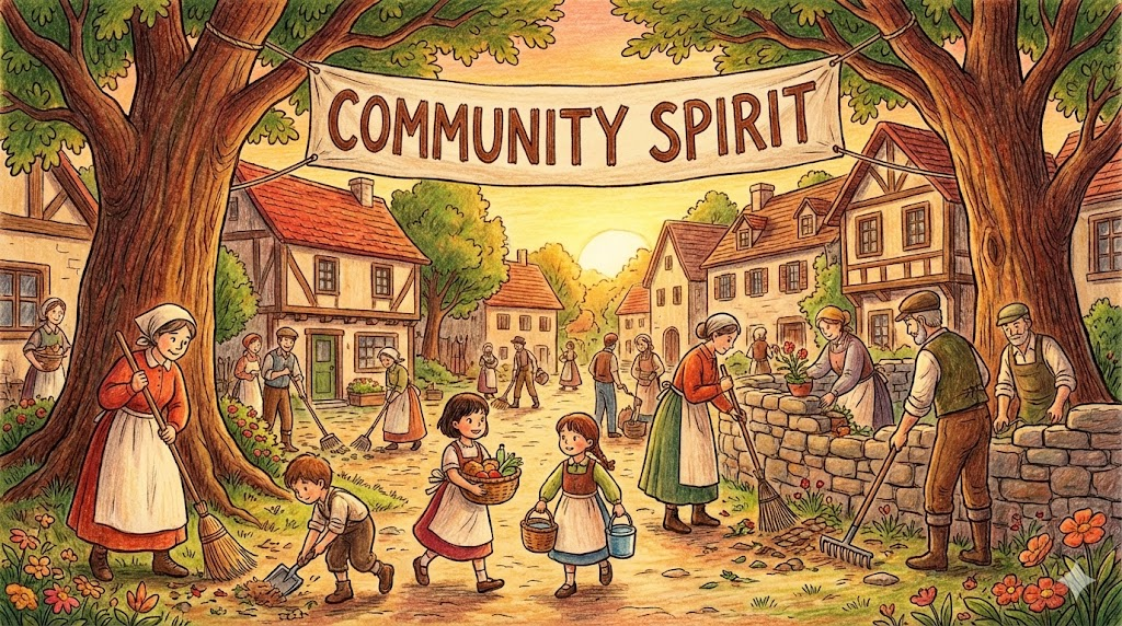 - Community spirit: 공동체의 이익을 위해 자발적으로 참여하고 협력하려는 마음, '공동체 정신(애향심/단결심)' 입니다. 재난 시 돕는 모습 등에서 잘 나타납니다.