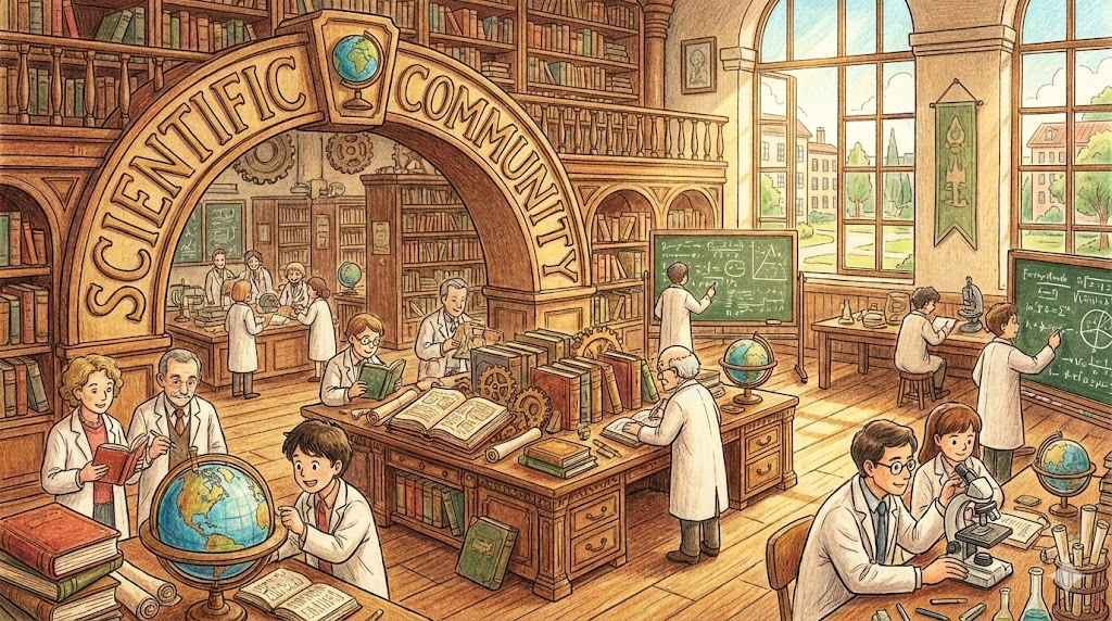 전 세계의 과학자들이 모여 연구 결과를 공유하고 검증하는 '지적인 네트워크' 를 말합니다. 단순히 과학자들이 모여 있는 집단이 아니라, 엄격한 검증 절차(Peer review)를 통해 무엇이 사실이고 무엇이 아닌지를 결정하는 '권위 있는 합의체' 로서의 성격이 강합니다. "과학계의 정설이다"라고 할 때 바로 이 집단의 인정을 받았다는 뜻입니다.
