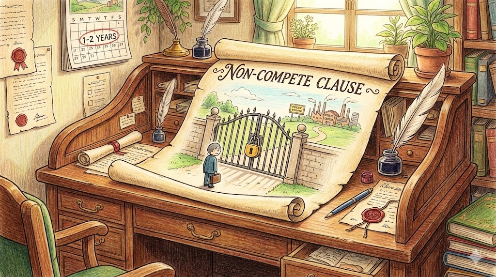 주로 근로 계약서에 등장하는 무시무시한 조항입니다. 직원이 회사를 그만둔 후, 일정 기간(보통 1~2년) 동안 '경쟁 회사로 이직하거나 비슷한 사업을 창업하지 못하도록 막는 약속' 을 말합니다. 회사의 영업 비밀이나 고객 명단을 빼돌려 경쟁사로 가는 것을 방지하기 위한 장치지만, 직업 선택의 자유를 침해한다는 논란도 있어 법적으로 효력을 다투는 경우가 많습니다.