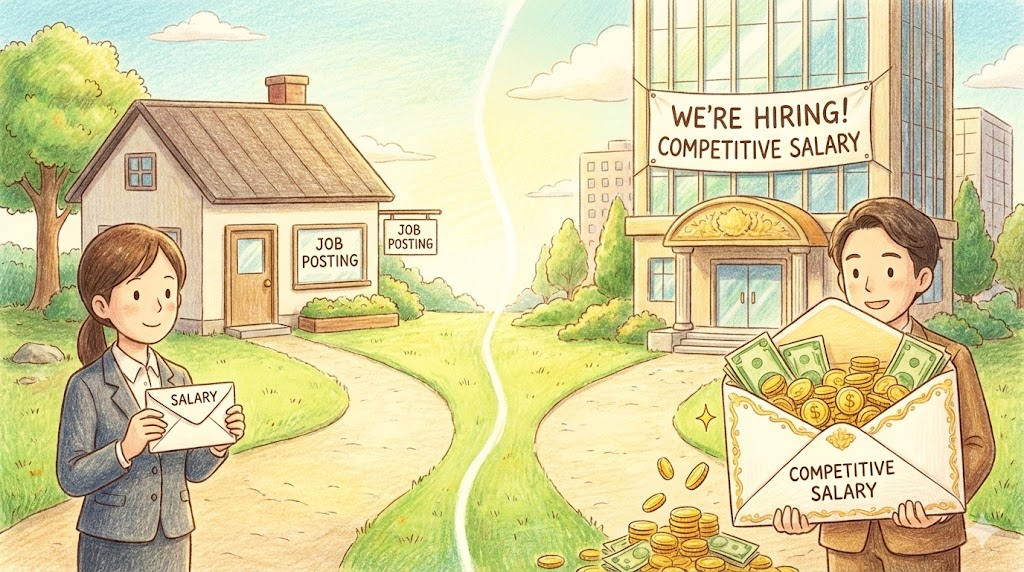 - Competitive salary: "경쟁심 있는 월급"이 아니라, 다른 회사와 비교했을 때 뒤지지 않거나 더 높아서 인재를 끌어들일 수 있는 '경쟁력 있는 급여(업계 최고 수준의 대우)' 입니다.