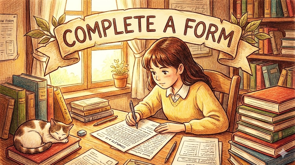 - Complete a form: 빈칸을 모두 채워 넣다, 즉 '서류를 작성하다(기입하다)' 라는 뜻의 격식 있는 표현입니다. (Fill out과 같음)