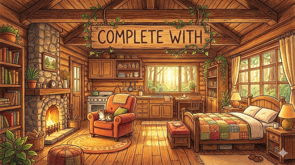 - 해석: (문법/부동산/광고) 어떤 시설이나 부속품이 빠짐없이 다 갖춰져 있다는 뜻입니다. 주로 "The house comes complete with furniture" 형태로 쓰입니다.