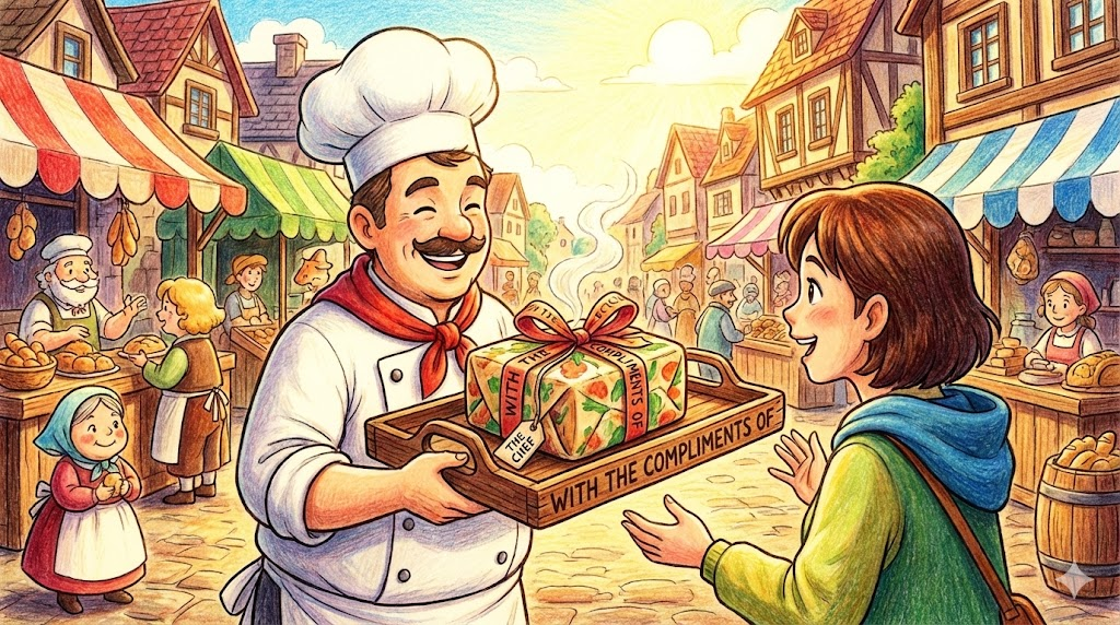 레스토랑에서 셰프가 서비스 요리를 내주거나, 회사에서 기념품을 보낼 때 "저희가 드리는 성의입니다"라는 뜻으로 쓰는 아주 정중하고 세련된 표현입니다. 주는 주체가 누구인지 뒤에 밝혀서(예: with the compliments of the chef), 호의를 베푸는 사람의 예의를 강조할 때 사용합니다.