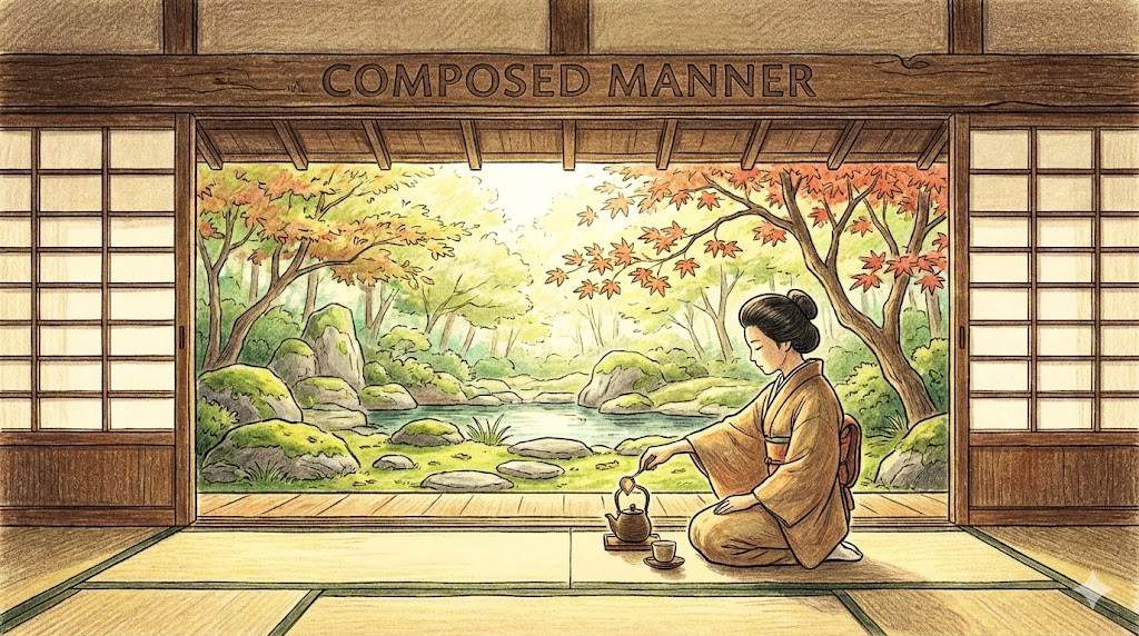 - Composed manner: 서두르지 않고 안정된, '차분한 태도' 입니다.