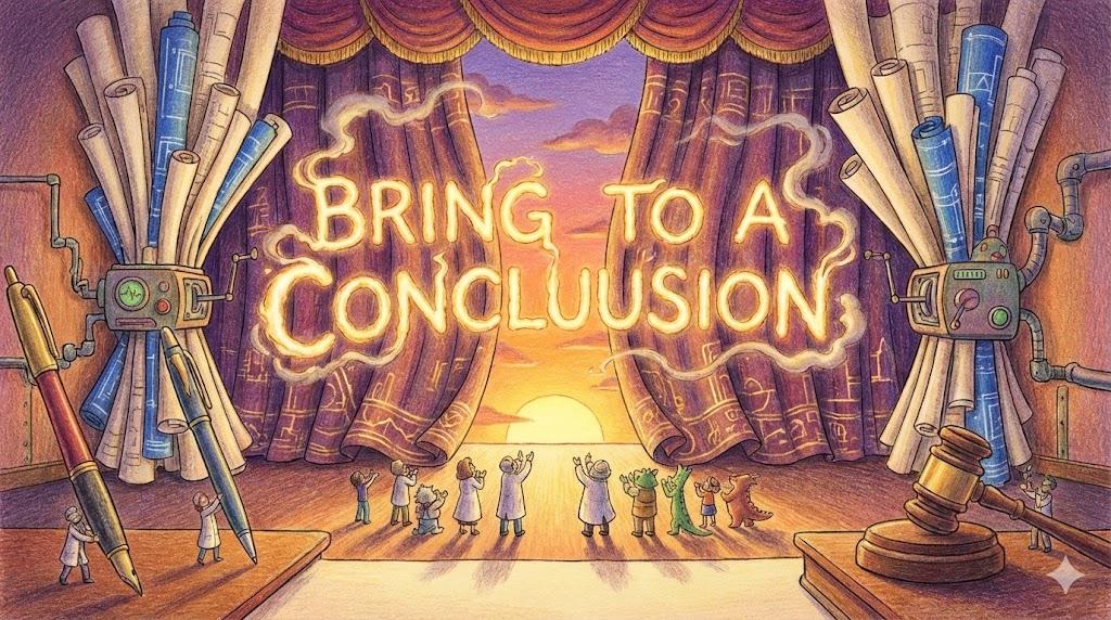 길어지거나 지지부진했던 논의, 프로젝트, 혹은 갈등 등을 '최종적으로 마무리하여 매듭짓는 행위' 를 강조합니다. "Finish"나 "End"보다 훨씬 격식 있고 적극적인 느낌을 주며, 단순히 끝나는 것이 아니라 '결과'를 만들어내며 끝낸다는 뉘앙스가 강합니다.