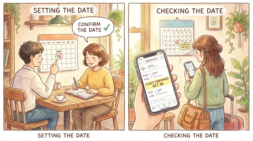 - Confirm the date: 약속 날짜가 맞는지 다시 한번 '날짜를 확인하다(확정 짓다)' 입니다.