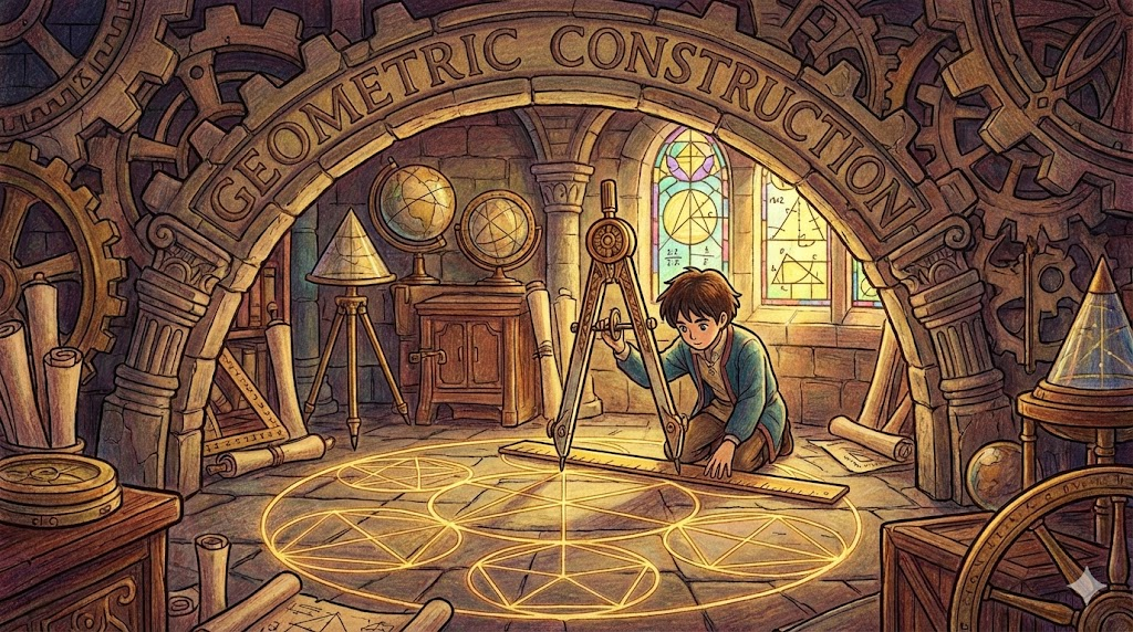 수학 시간에 자(눈금 없는 자)와 컴퍼스만을 사용하여 '도형을 정확하게 그리는 행위' 를 말합니다. 단순히 대충 그리는 스케치(Sketch)와는 다릅니다. 고대 그리스 수학에서 유래한 엄격한 규칙에 따라 정삼각형을 그리거나 각을 이등분하는 등의 과정을 뜻하는 전문 용어입니다.