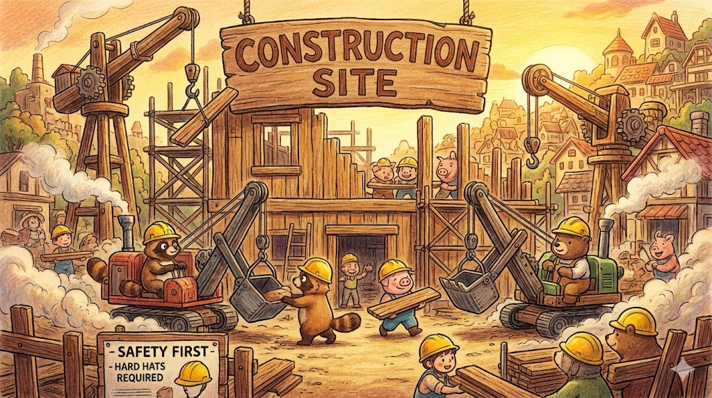 - 해석: 건물을 짓고 있는 장소입니다. 안전모(Hard hat) 착용이 필수인 곳입니다.