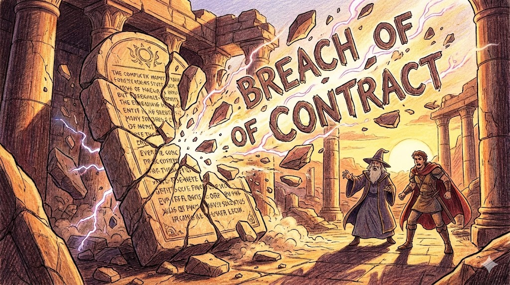 - 해석: (법률) 계약서에 명시된 내용을 지키지 않는 행위입니다. 소송의 원인이 됩니다.
