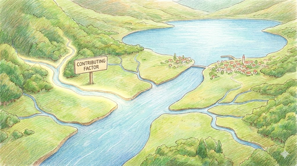 - 해석: (분석/논설) 어떤 결과(주로 사고나 현상)를 발생시킨 여러 가지 원인 중 하나를 말합니다.