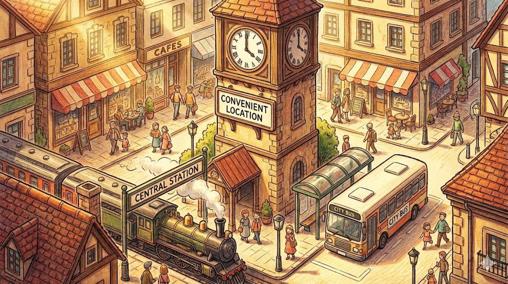 - 해석: (부동산/여행) 역에서 가깝거나 접근성이 좋아서 찾아가기 쉬운 장소를 말합니다.