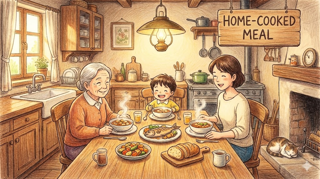 식당 음식(Restaurant food)이나 인스턴트 식품(Processed food)과 대비되는 개념입니다. 단순히 집에서 먹는다는 뜻을 넘어, '가족을 위한 정성과 사랑이 들어간 건강하고 따뜻한 음식' 이라는 감성적인 뉘앙스를 담고 있습니다. 유학 생활이나 타지 생활을 할 때 가장 그리워하는 것입니다.