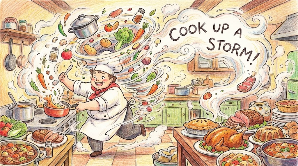 cook up a storm [kʊk ʌp ə stɔrm]