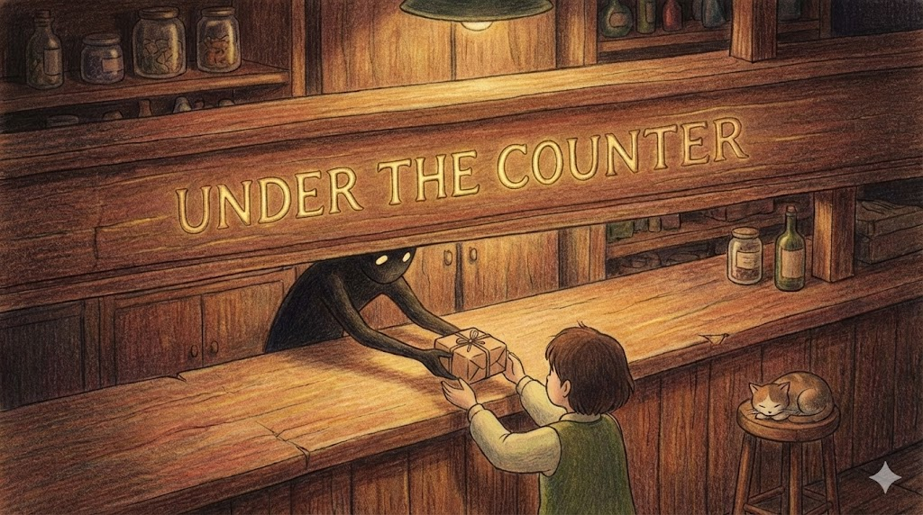 - 해석: (관용구) 가게의 계산대(Counter) 아래로 몰래 물건을 주고받는다는 뜻에서, 불법적이거나 비밀리에 거래되는 것을 말합니다.