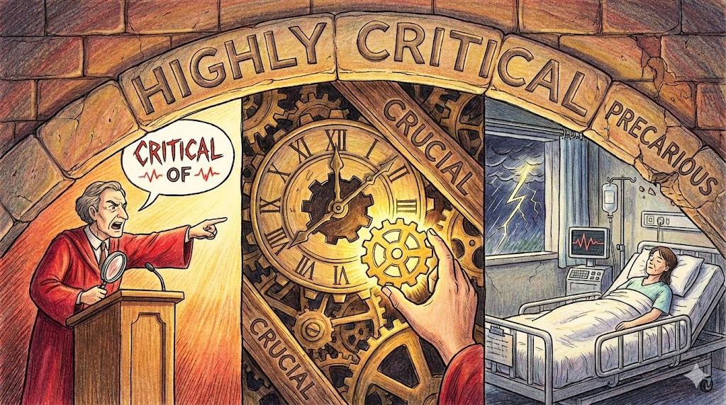 | 종합 뉘앙스 | (1) 깐깐하게 따지는 '비판적인'. (2) 매우 중요한 '결정적인'. (3) 상태가 안 좋은 '위독한'. | '판단이 필요한 긴박한 상태' |