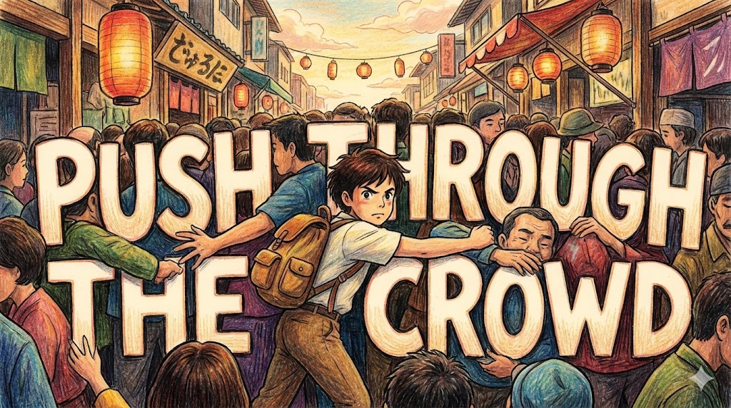 - 해석: 사람들이 빽빽하게 모여 있는 틈을 어깨로 밀며 힘겹게 지나가는 모습입니다.