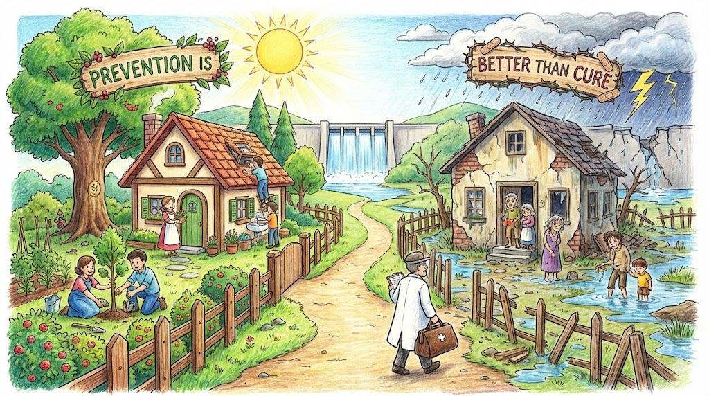 병에 걸린 뒤에 아파하고 돈을 쓰며 치료하는 것보다, 애초에 병에 걸리지 않도록 손을 씻고 백신을 맞는 등 조심하는 것이 훨씬 현명하다는 아주 유명한 영어 속담입니다. 건강 문제뿐만 아니라 기계 고장, 범죄, 사고 등 우리 삶의 모든 영역에서 '사전 대비의 중요성' 을 강조할 때 두루 쓰입니다.