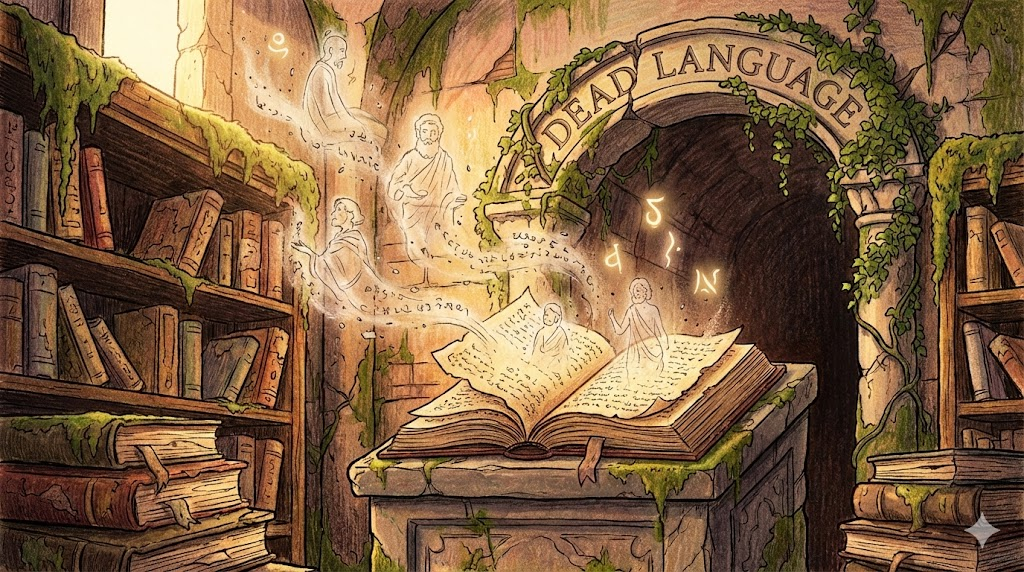 - 해석: (학술/언어학) 라틴어(Latin)나 고대 그리스어처럼, 그 언어를 모국어로 사용하는 원어민 인구가 더 이상 존재하지 않는 언어입니다.