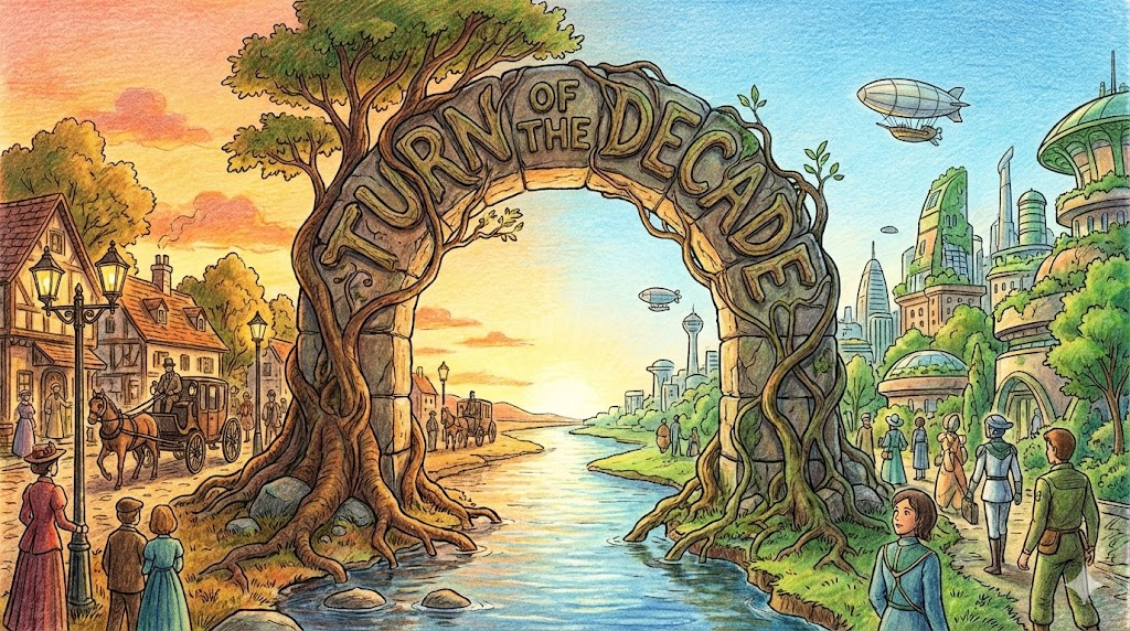 'turn(전환, 바뀜)'을 사용하여 하나의 10년 단위가 끝나고 새로운 10년 단위가 시작되는 바로 그 교차점(예: 1989년에서 1990년으로, 2019년에서 2020년으로 넘어가는 시점)을 의미합니다. 흔히 "turn of the century(세기의 전환기)"라는 표현으로 더 많이 쓰이지만, 10년 단위의 트렌드 변화나 시대적 전환점을 묘사할 때 역사, 문화, 예술 분야에서 아주 세련되게 쓰이는 표현입니다.