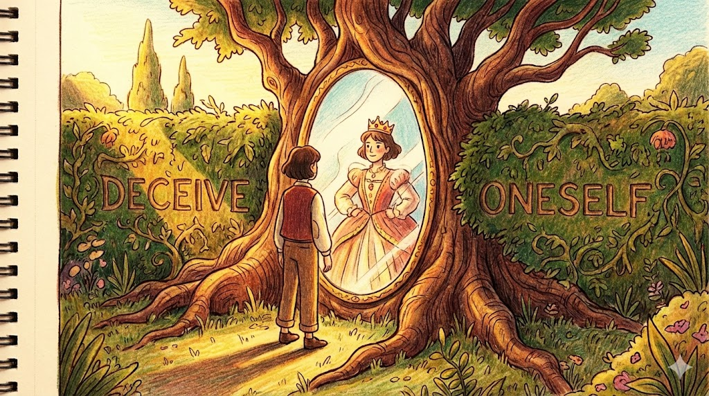 - 해석: (심리/철학) 진실을 뻔히 알면서도 그것을 인정하기 싫어서 스스로 거짓을 믿도록 만드는 자기 방어적 태도입니다.