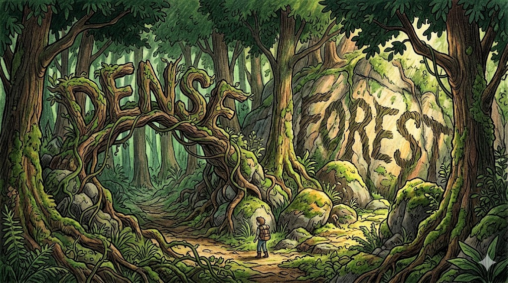 | Thick | 두께와 부피(Dimension): 숲이나 안개가 물리적으로 '얼마나 두껍고 무겁게 층을 이루고 있는가' 에 초점을 맞춥니다. 시각적/물리적인 두꺼움입니다. | 두꺼운 책(Thick book), 걸쭉한 수프(Thick soup) 등. (Dense forest와 Thick forest는 둘 다 자주 쓰임) |